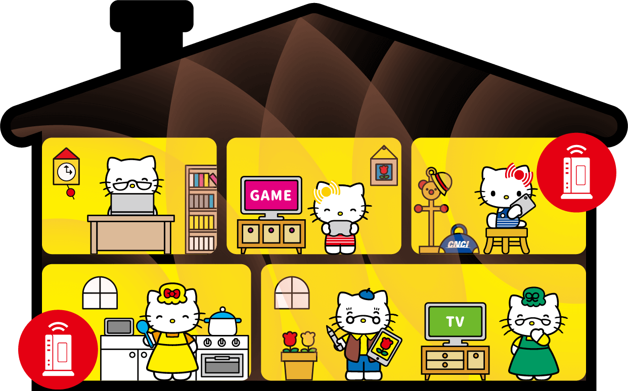 ルーター2台でもっとつながる♪ メッシュWi-Fiルーター2台標準設置 高速光インターネット+テレビ+電話 初期導入工事費実質無料 CNCiグループ × HELLO KITTY ©2024 SANRIO CO., LTD. APPROVAL NO. L648190