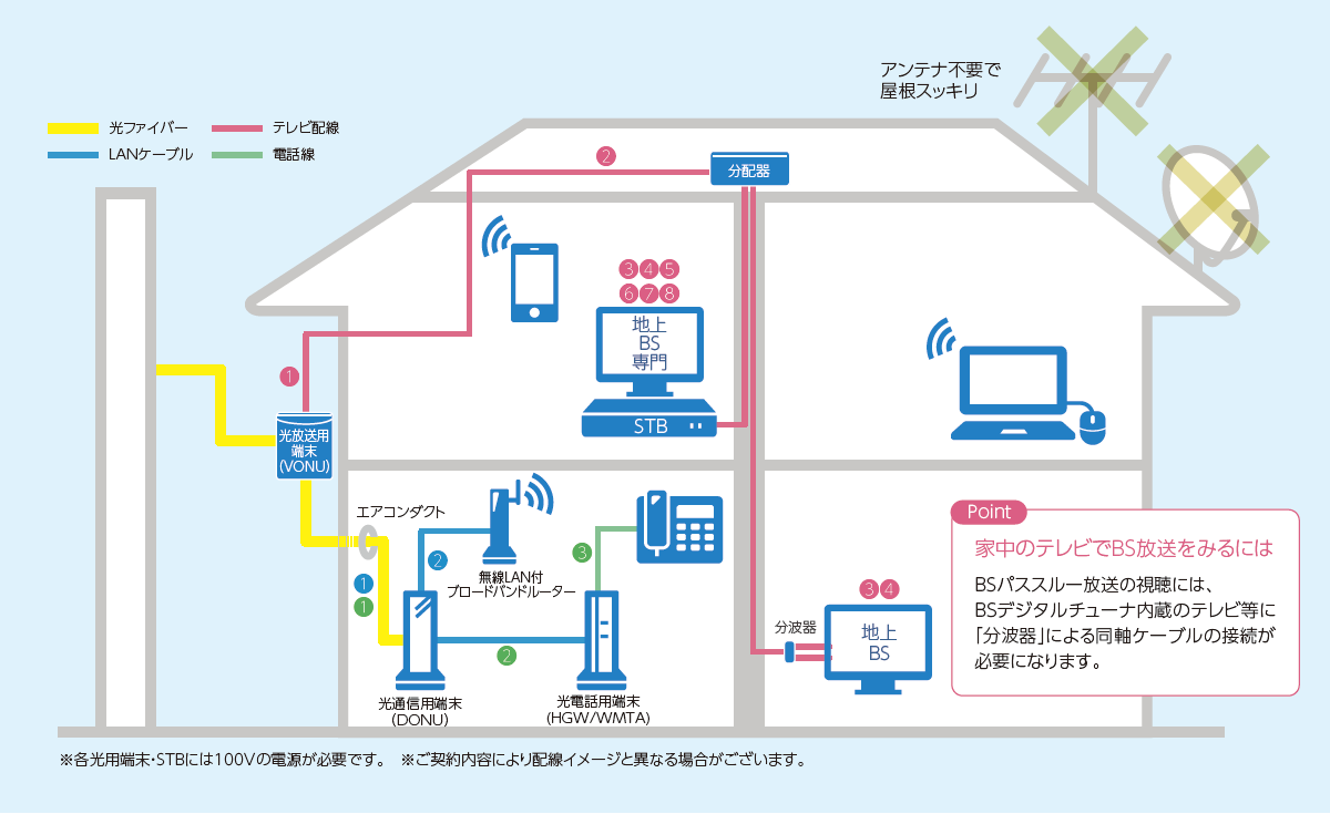 4.BSパススルー対応テレビは、宅内壁面ユニット間に「分波器」を設置し配線